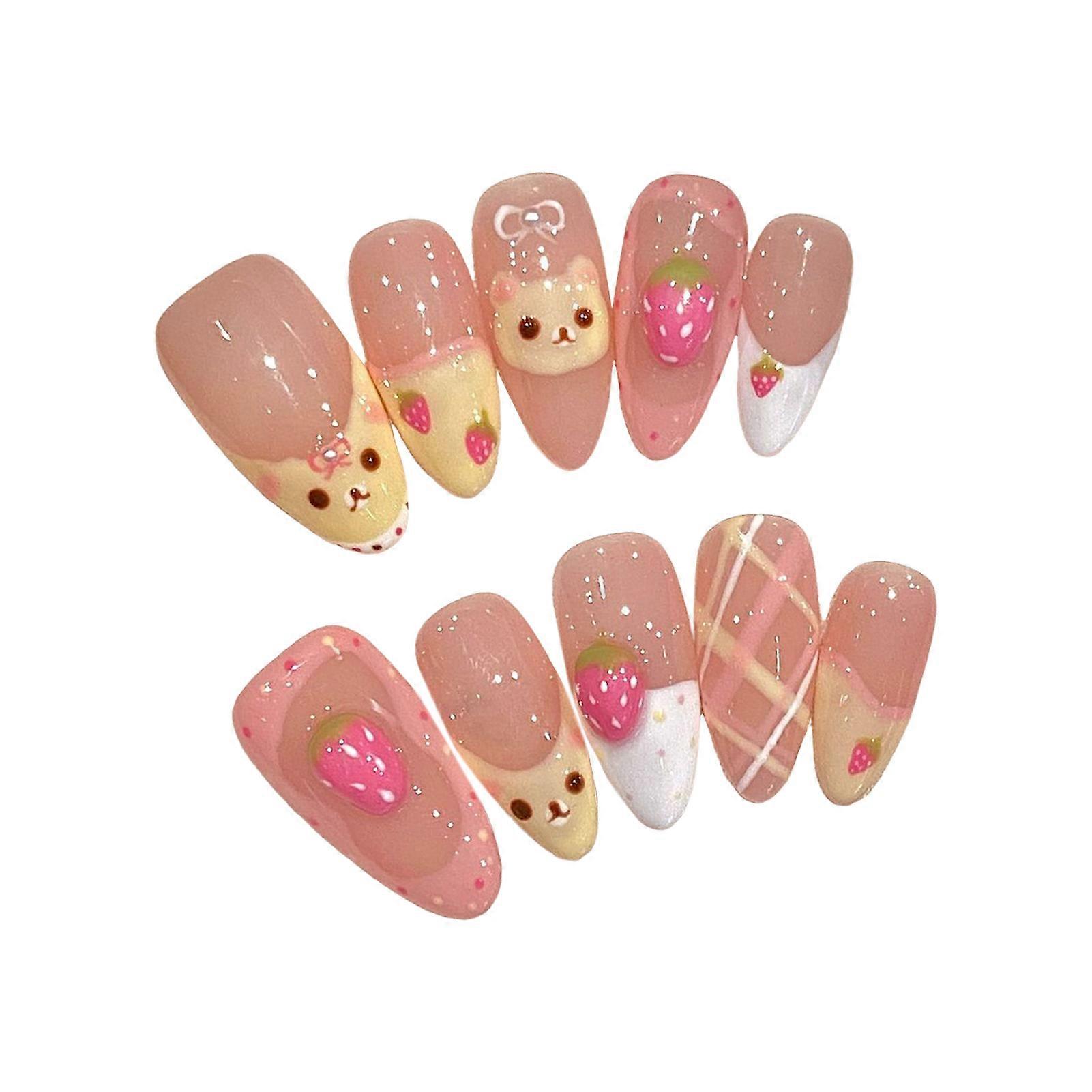 Features: Cute Cartoon Bear Design: Elevate your nail game with our adorable cartoon bear press on nails, featuring a fun and playful design that will make your nails stand out. Easy DIY Application: Our full cover oval pink stick on nails are designed for easy application at home, perfect for diy nail design art salon or at-home manicure kits. High-Quality Materials: Made with premium artificial nail materials, our women full cover artificial nails are durable and long-lasting, ensuring a salon-quality manicure every time. Versatile Oval Tip Shape: The oval tip pink sweet style false nails come in a versatile oval shape that flatters all nail sizes and shapes, providing a comfortable and natural fit. Trendy Pink Color Palette: Embrace the latest nail trends with our cute pink fresh press on nails, featuring a sweet pink color palette that is perfect for women and girls looking to express their style. Specification: Material: Resin Size,Thumb(mm),Index Finger(mm),Middle Finger(mm),The Fourth Finger(mm),Little Finger(mm) XS,14,10,11,10,7 S,15,11,12,11,8 M,16,12,13,12,9 L,17,13,14,13,10 Notes: 1. The real color of the item may be slightly different from the pictures shown on website caused by many factors such as brightness of your monitor and light brightness. 2. Please allow slight manual measurement deviation for the data. Include: 10pcs/set*Bear Artificial Nail Art Tips Kit