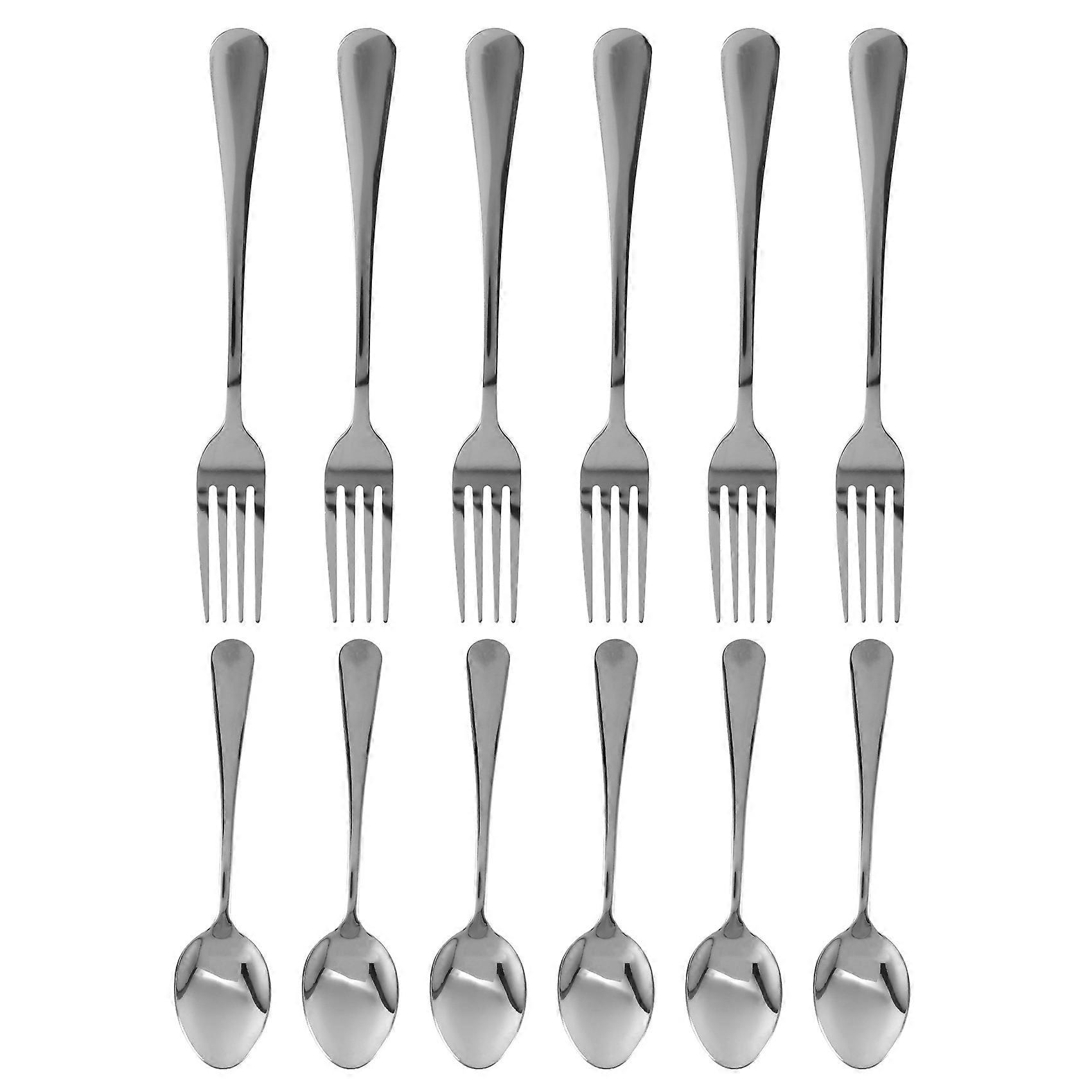 12: 6 pieces of Stainless steel forks and 6 pieces of spoons. Great for everyday use, hotel, restaurant, entertaining, holiday meal and more. : Made of high quality stainless steel which ensures , Rust-resistant, sturdy and durable for years to come. GREAT : Clean and looking, surface and mirror polish makes these forks always keep shining, Modern silverware would match well with your existing cutlery and elevate your everyday meals into a fine dining experience. GREAT FOR USE: These dinner forks have a weight and length, Not too heavy, not too light, Well balanced and comfortable to hold. EASY TO CLEAN: Dishwasher-safe, heavy duty and durable. Colour: silver Material: stainless steel Package Contents: 6 * Spoons (17cm) 6 * Forks (20cm) Only the above package content, other products are not included. Note: Light and different displays may cause the color of the item in the picture a little different from the real thing. The measurement allowed error is +/- 1-3cm.
