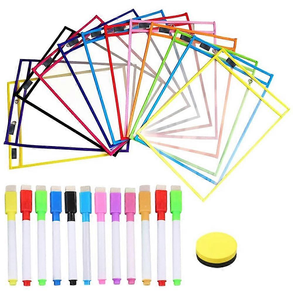 12 Pieces Dry Erase Bags,Reusable Learning and Collecting Bags with 12 Pen Holders and 1 Eraser for