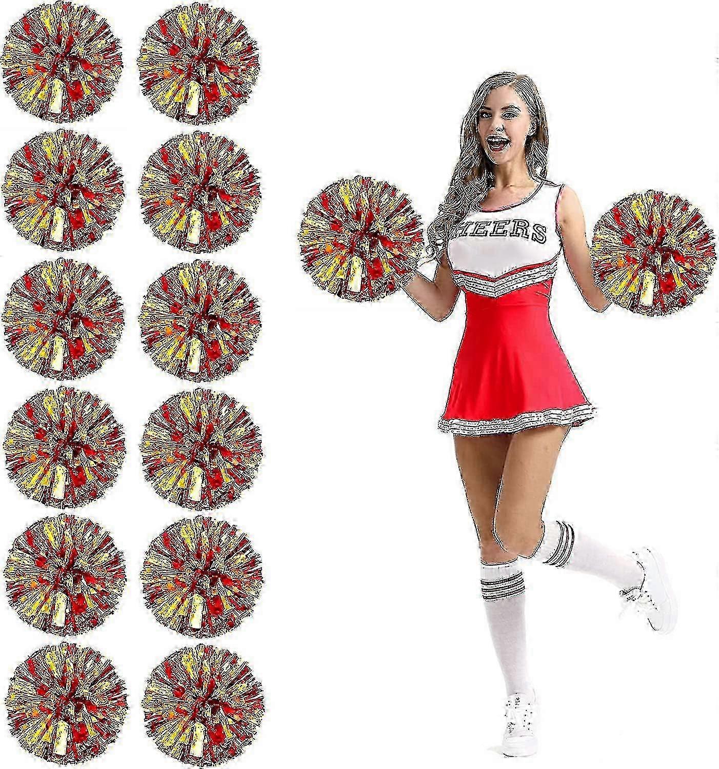 12pcs Cheerleading Pom Poms with Finger Holes for Cheerleading, Metallic Foil G-Red Gold Medium Size Pom Poms