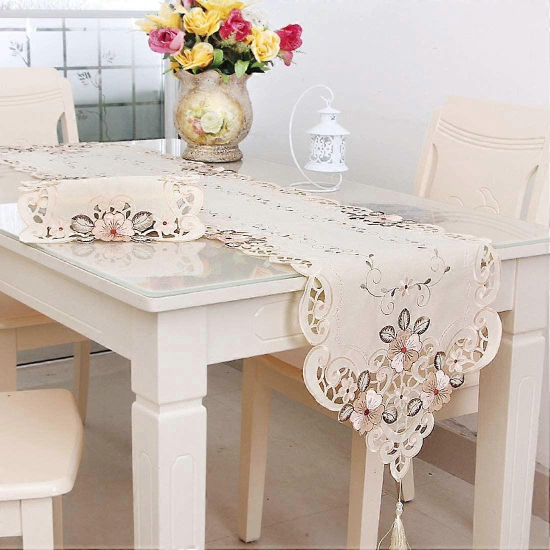 15 Inch X 96 Inch Classic Flowers Embroidered Table Runner, Floral Lace Fabric Table Top Home Decoration