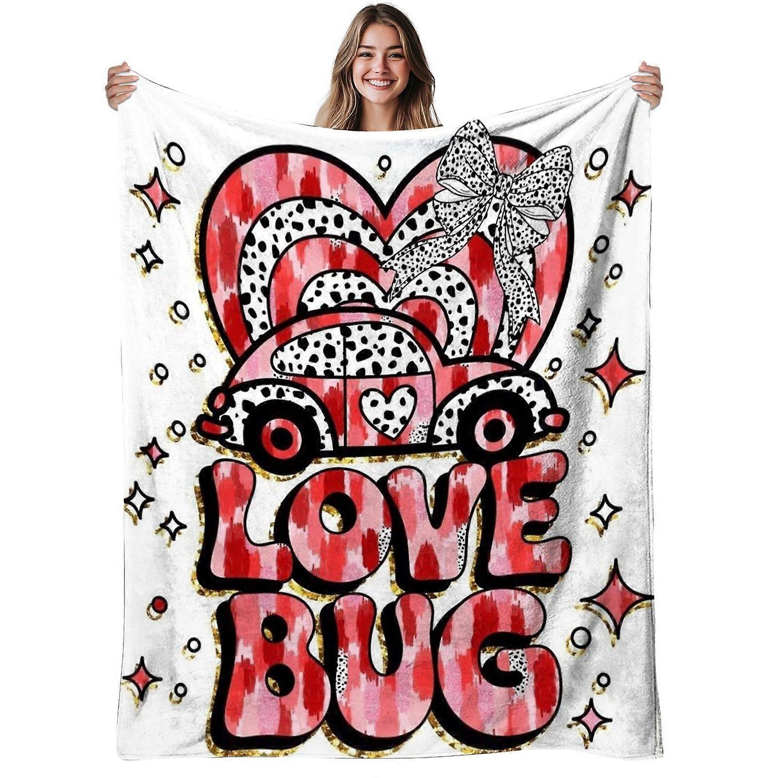 1pc Love Bug Flannel Blanket | Soft, Warm, Heart Bow Retro Car Print, Polyester, 280gsm, All-Season Use, Ideal for Bedro-qacvbg260