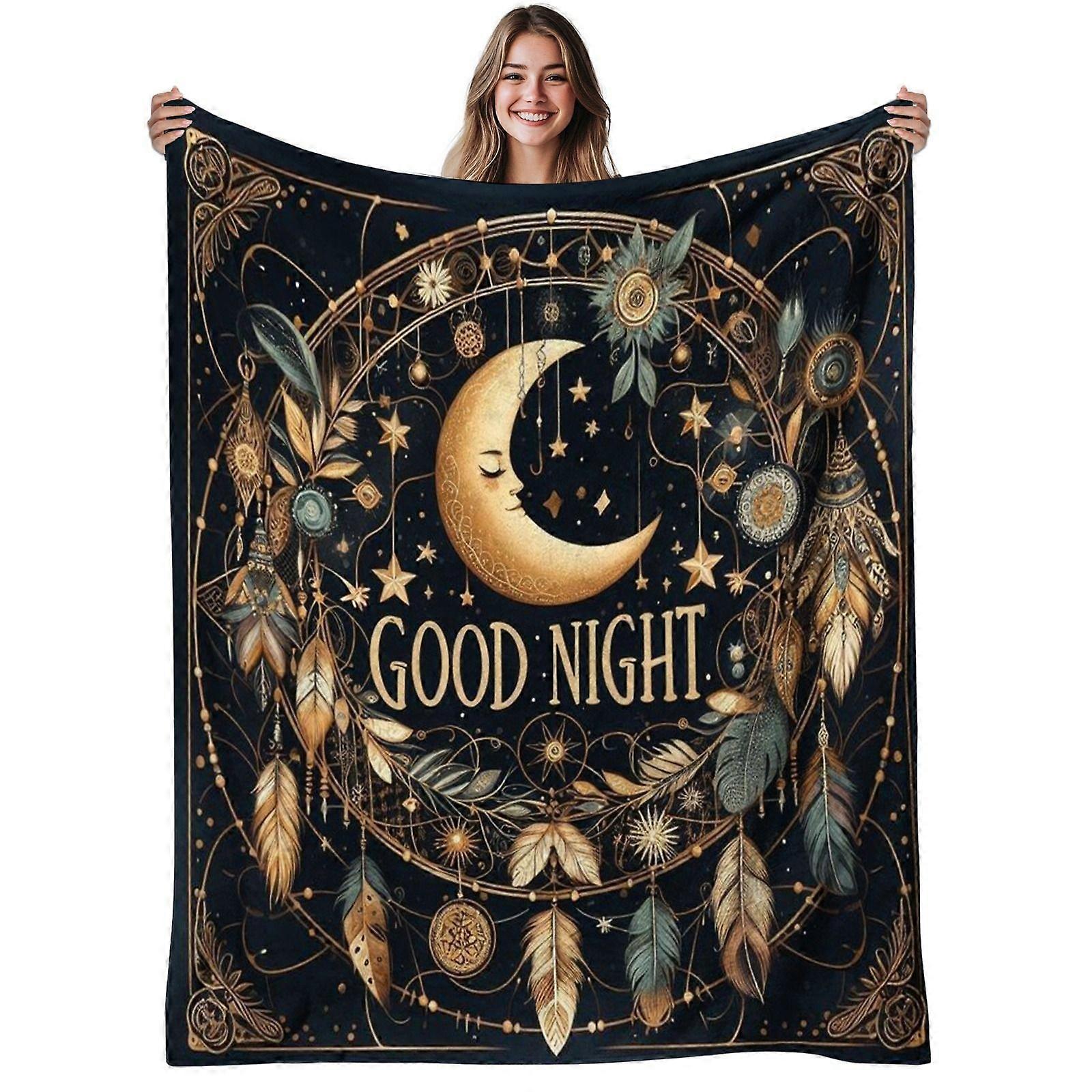 1pc Moon and Stars Flannel Blanket | Soft, Warm, Bohemian Design, Polyester, 280gsm, All-Season Use, Ideal for Bedroom, -qacvbg230