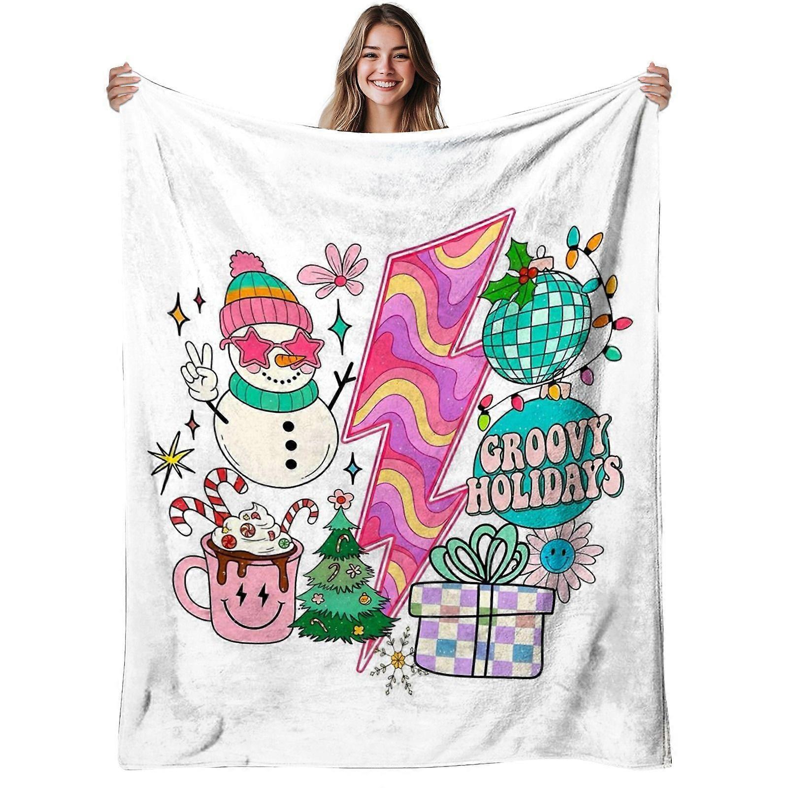 1pc Snowman Lightning Retro Style Flannel Blanket | Soft, Warm, Groovy Holiday Design Print, Polyester, 280gsm, All-Seas-qacvbg397