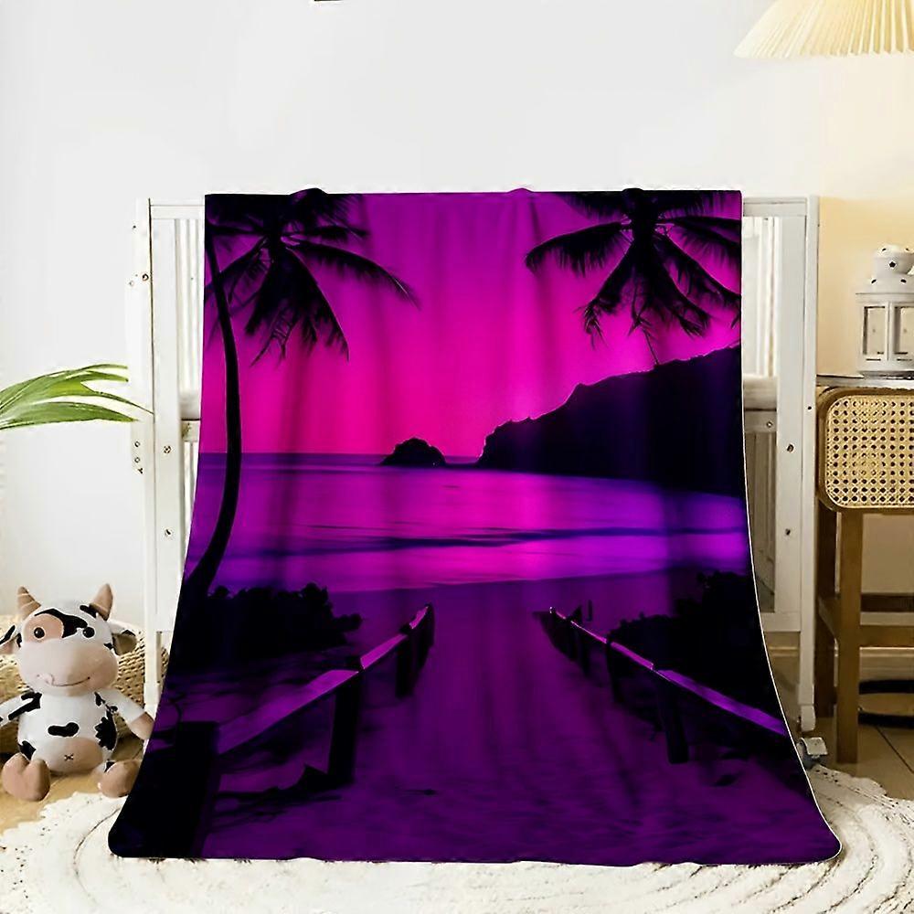 1pc Tropical Beach Sunset Flannel Blanket - Soft Warmth-Whispering Bed Drape with Palm Trees & Purple Sky Design, Machin-AZXCV207