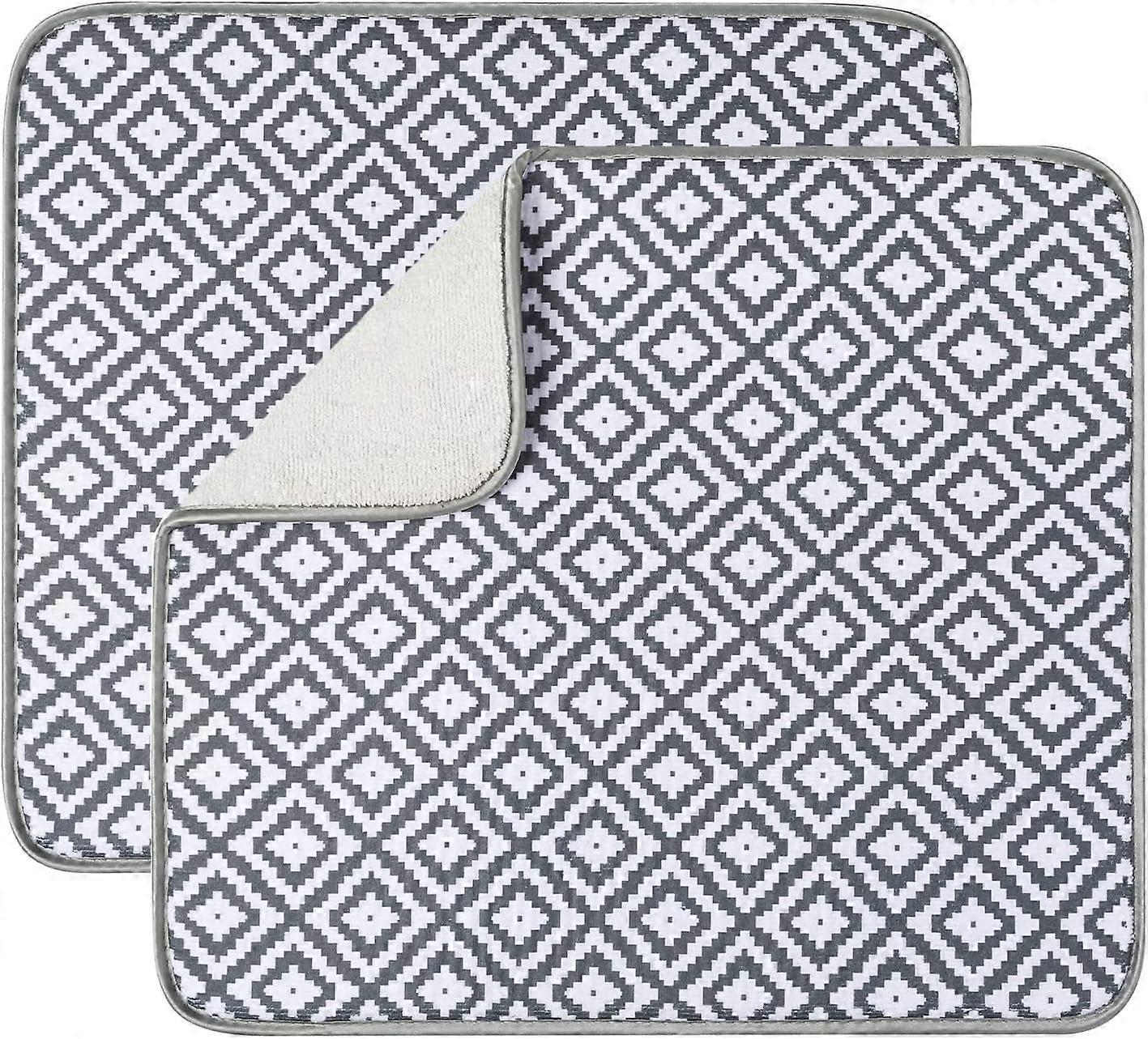 2 Packs Dish Drying Mat for Kitchen, Super Absorbent Reversible Microfiber Dishes Drying Pads for Kitchen Counter 16 Inch x 18 Inch, Grey Rhombus