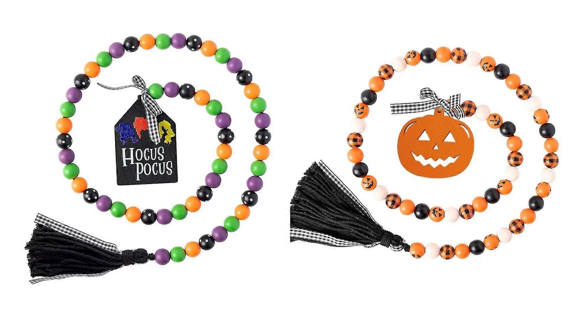 2 Pcs Halloween Wooden Bead Garland Wreath With Tassel Wood Bead Garland With Ghost And Black Farmhouse Bead Garland Halloween Beads Garland For