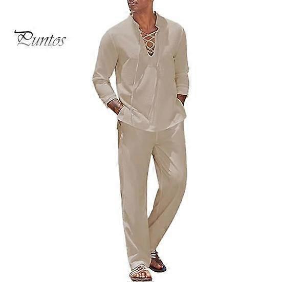 2Pcs/Set Men Casual Outfit Stand Collar V-Neck Lace-up Long Sleeve Tops Solid Color Loose Fit Long Pants Set