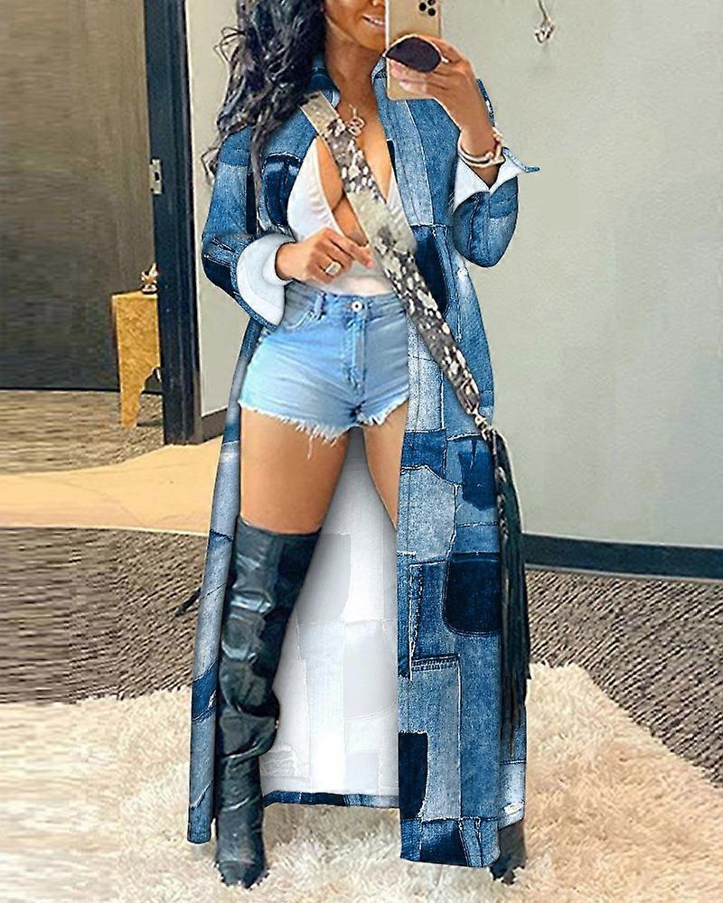 2023 New Fashion Casual Elegant Denim Look Print Longline Jackets Coats Winter Jacket Women