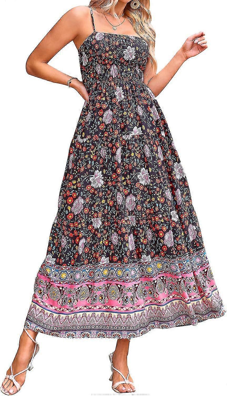 2024 Women Sleeveless Retro Floral Bohemian Dress Adjustable Shoulder Strap With Pocket