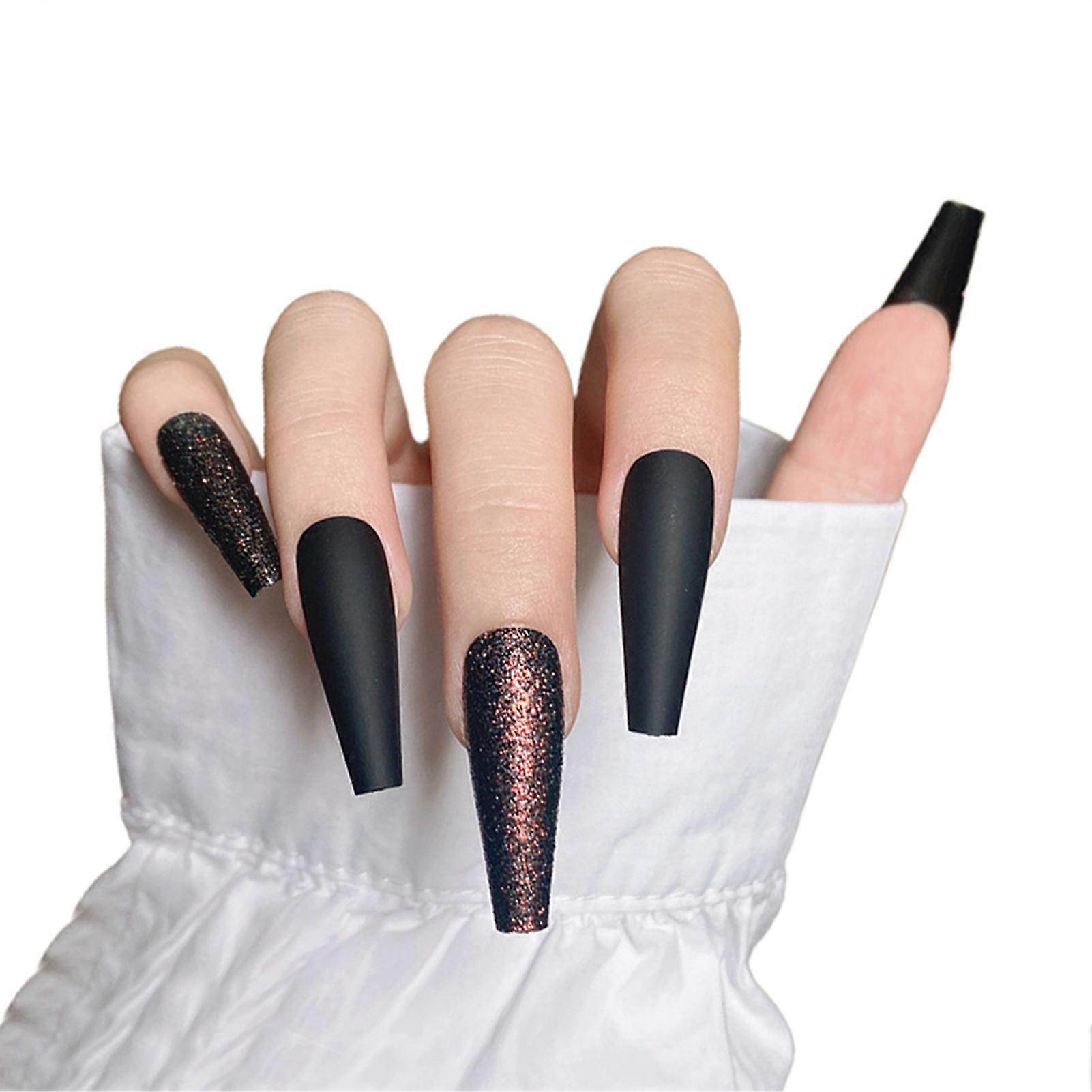 24pcs Black Glitter Nail Patch Glue Type Removable Long Paragraph Fashion