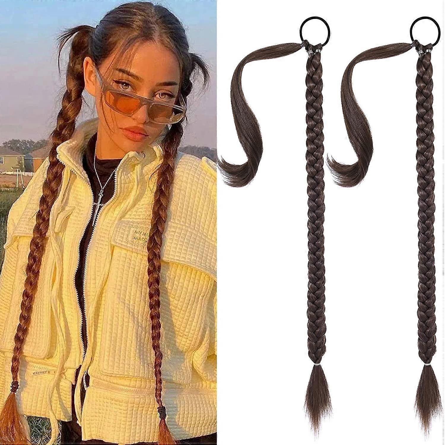 2PCS DIY Braided Ponytail Extension with Hair Tie Long Straight Wrap Dark Brown Highlights 26 Inch (After Braided 23 Inch)