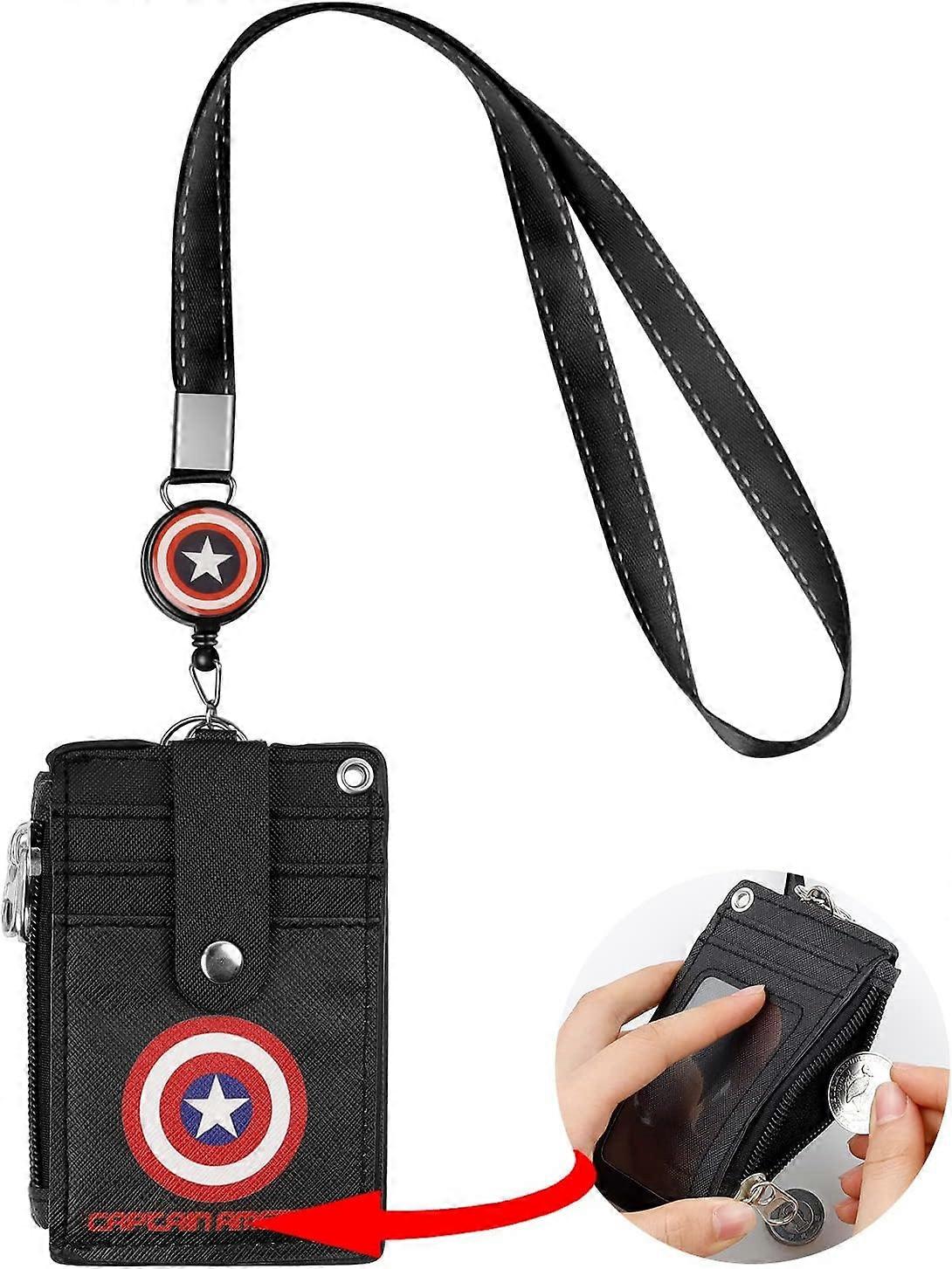 2pcs PU Lanyard Card Holder, 5 Card Slots and 1 Zipper Pocket, Total Length 57cm, Badge Holder with Retractable Buckle, Black Cute Cartoon Style