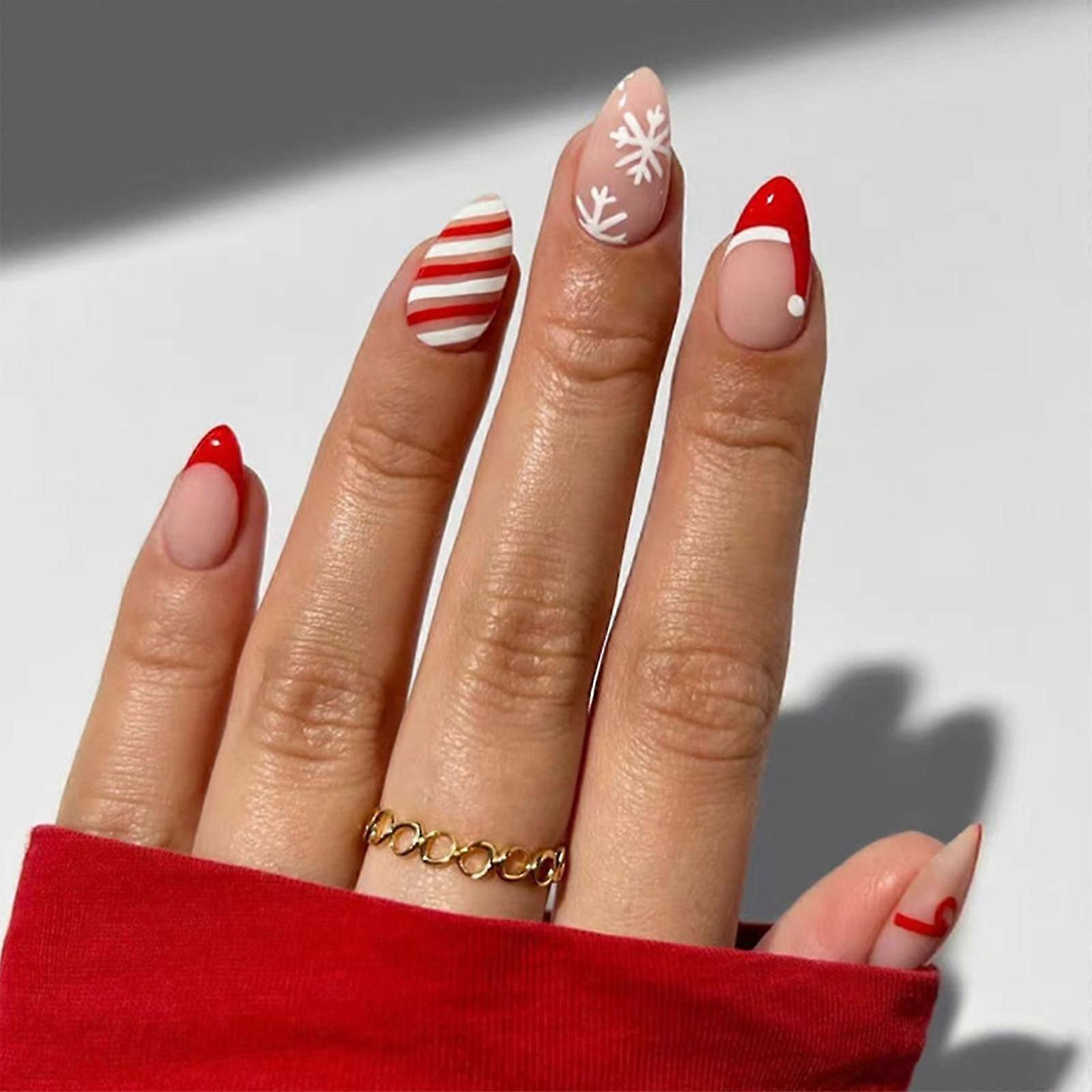 30x Christmas Full Cover Stick on Nail Stripes Press On Nail Almond Shape False