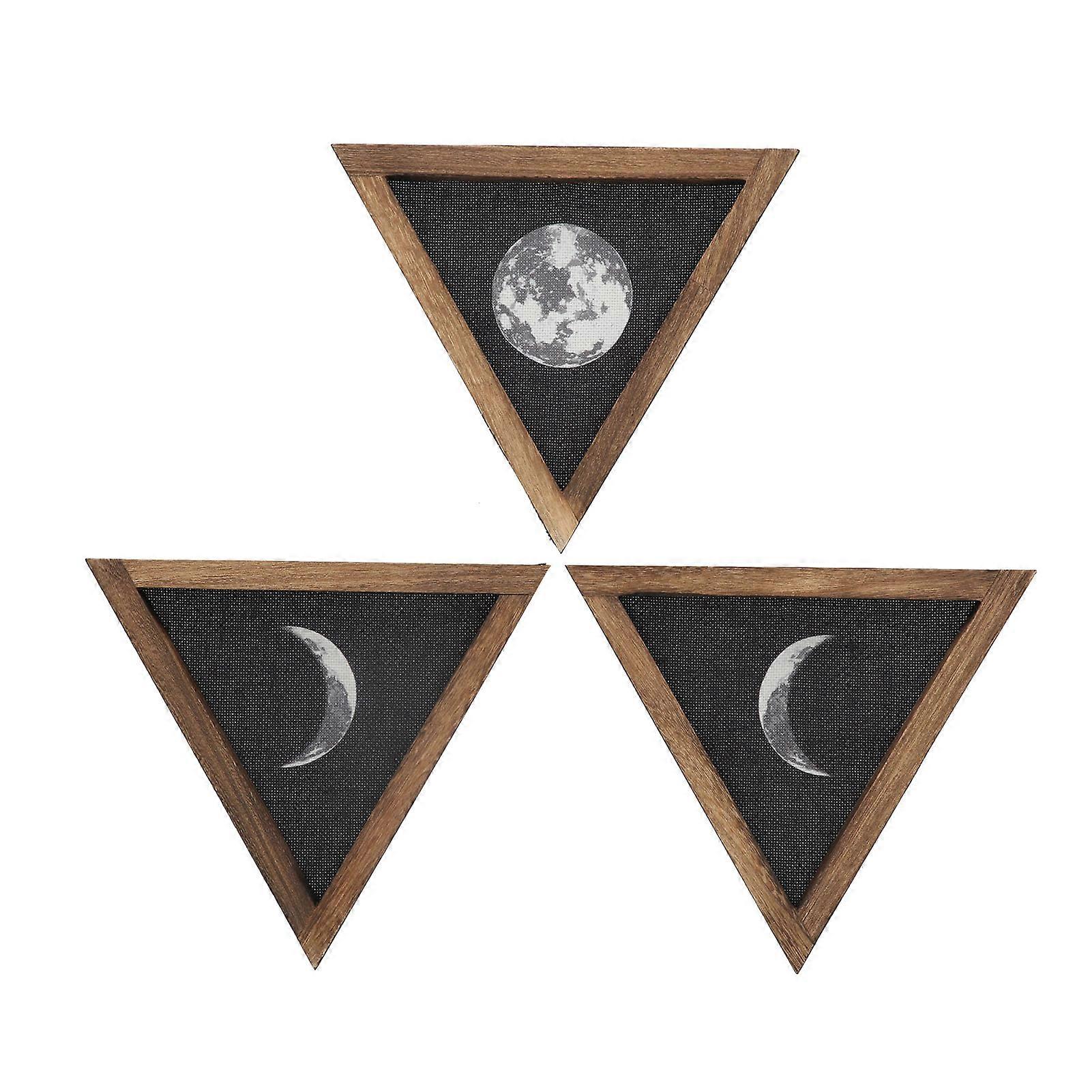 3Pcs Rustic Wall Moon Phase Decor Triangular Wall Art for Bedroom Living Room, Metal & Wood, Boho Style, 12x10 Inches