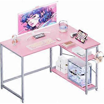 43 Inch L Shaped Computer Desk with Reversible Side Shelves, Small Corner Desk for Home Office, Writing Study Table PC Desk, Pink with Gray Leg