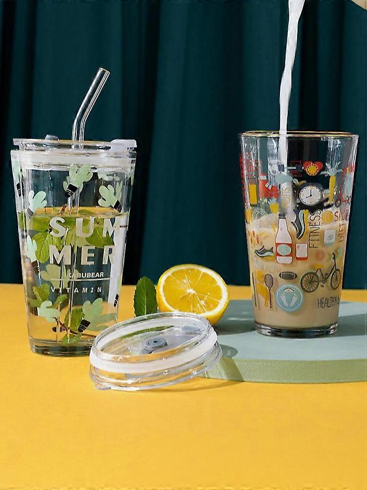 450ml Cartoon Glass Cup with Straw, Office Scale Milk Juice Cup