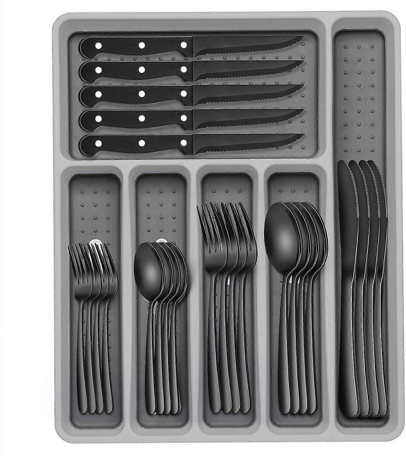 49-Piece Hammered Silverware Set with Organizer, Heavy Duty Stainless Steel Flatware for 8, compatible with steak knives, rust-proof, mirror