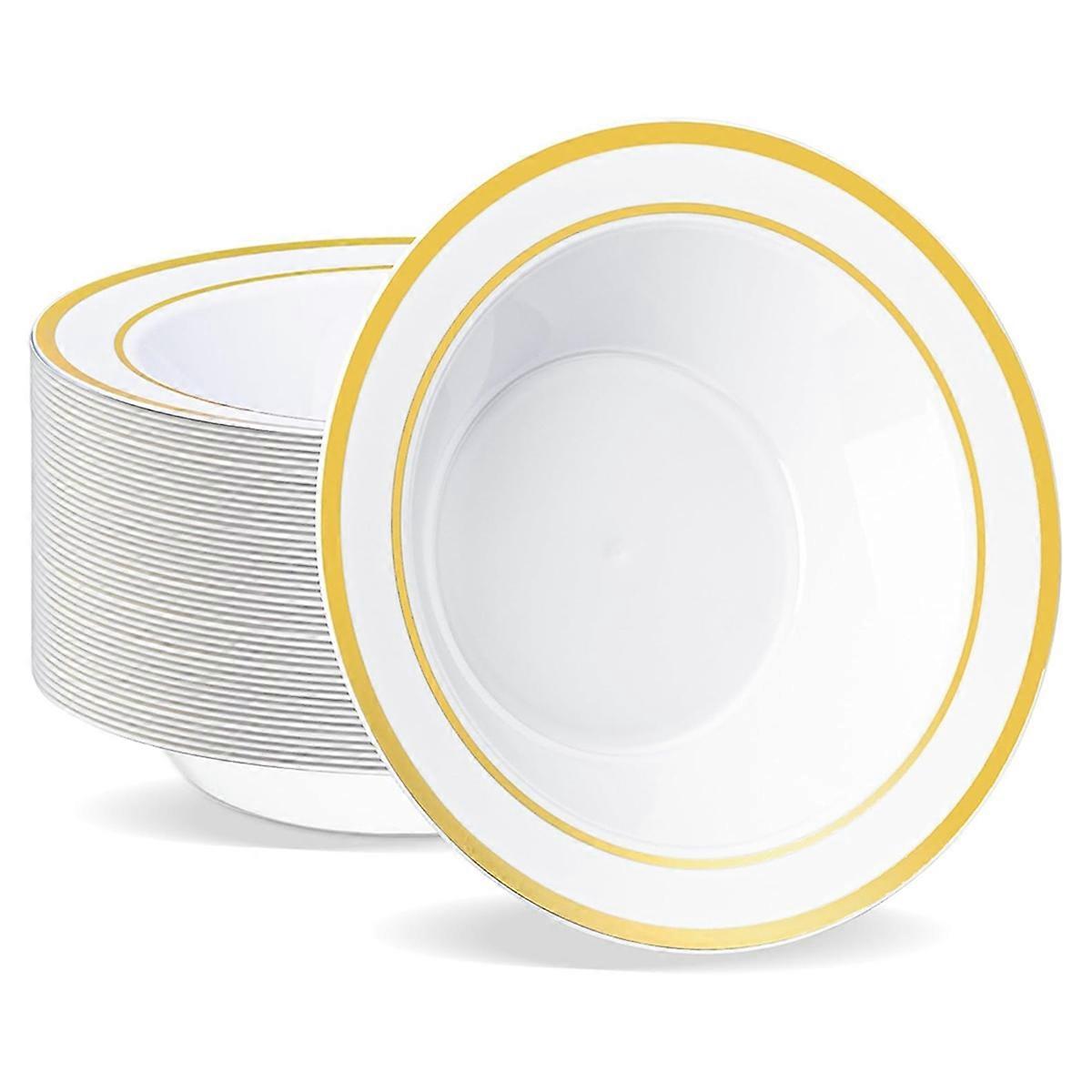 50 PCS Plastic Bowls with Gold Rim,7.5inch 12 Oz Disposable Soup Bowls,Heavy-Duty Dessert Salad Bow
