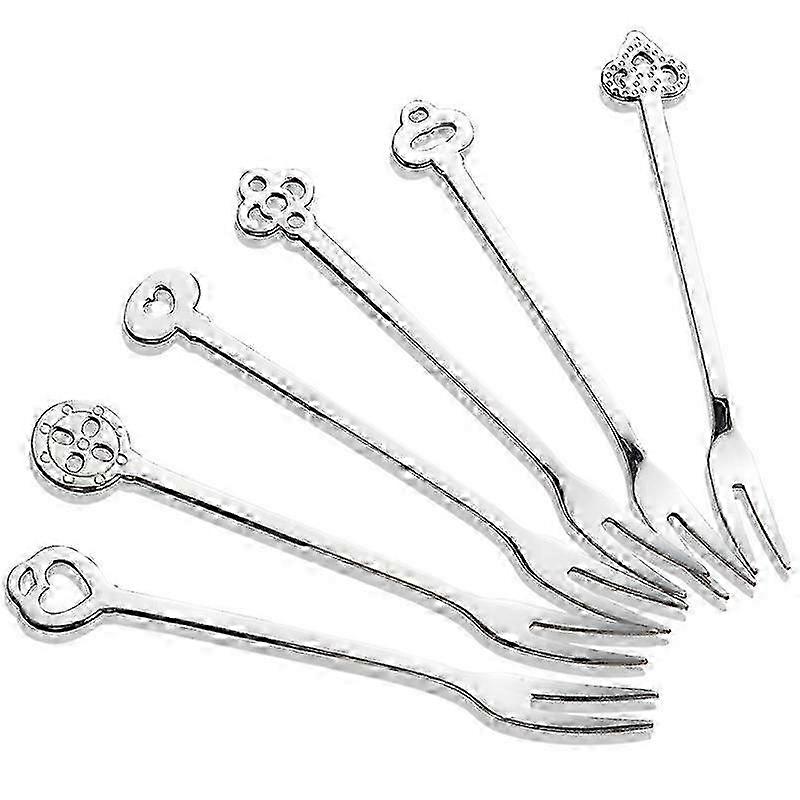 6 cutlery forks with flower stems, dessert forks, and fruit forks<br> 1.6 Sophisticated styles,Simple and stylish,Compact and practical forks with different handle patterns for easy identification in a gift box.<br> 2.Made of high quality stainless steel, dishwasher safe.<br> 3. Perfect for fruits, desserts, pastries, cakes, salads, cocktails, pickles, appetisers or seafood, etc.<br> 4. Ideal for home, banquets, restaurants, cafes, bistros, bars or wedding parties.<br> 5.Elegant, glossy and polished finish forks. Beautifully packaged, gift choice.<br> Color: Sliver<br> Material:Stainless Steel<br> Fork Length: About 13cm<br> Package Content:6 x Fruit Fork<br> Note: Due to the light and screen setting difference, the item's color may be slightly different from the pictures. Please allow slight dimension difference due to different manual measurement. Sold by-YJL official store