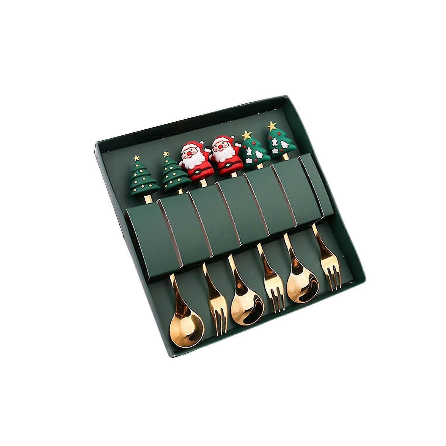 6Pcs/Set Christmas Fork Spoon Kit with Gift Box Food Grade Stainless Steel Xmas Charm Topper Long Ha