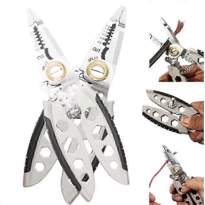Description: Function: Stripping wire Specification: 7 inches Total length: 185mm Opening range: 0-40mm Weight: 140g Blade material: nickel chromium steel (stainless steel) Material: Chromium vanadium alloy steel Color: black gray Features: 1. High Precision, Stripping Hole Design 2. Handle Wrench, Capable Of Tightening Hexagonal Screws 3. The Cutting Edge Of The Hole Is Sharp And The Incision Is Neat Without Damaging The Wire Core. 4. Ergonomic Handle, Anti-slip And Comfortable 5. Overall Heat Treatment, High Hardness, Sharp Blade, Smooth Incision, And Fast Shearing Package Included: 1 * (1 pliers)