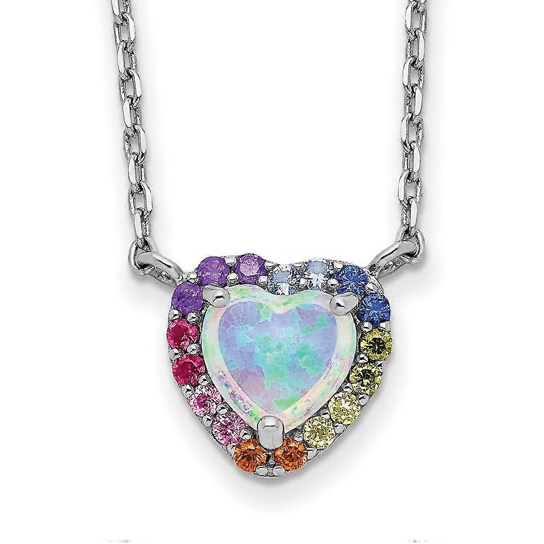 8.3mm Sterling Silver Rhodium-plated Created Opal Colorful Cubic Zirconia Heart With 2 Inch Extension Necklace - 16 Inch - 1.6 Grams In Sterling Silver in Plated Metal - - Charm/Element Width: 8.3 mm - Width of Item: 8.3 mm - Charm/Element Length: 7.9 mm - Length of Item: 18 in - Chain Length: 16 in - Chain Width: 0.5 mm - Clasp /Connector: Spring Ring - Finish: Polished - Chain Type: Cable - Feature: Solid - Extender Length: 2 in - Engravable: Not Recommended - Clasp Width (Male end): 5.15 mm - Clasp Width (Femal - - [ Potential Enhancement Methods: cubic zirconia ] - Synthetic. Some are covered with a product that makes the stone more durable. - [ Care and Handling: cubic zirconia ] - Clean with warm soapy water and a soft cloth. - - [ Potential Enhancement Methods: created opal ] - Grown in a laboratory, but are chemically, physically and optically identical to natural gems. Natural gems typically have inclusions from the crystallization process, where gases and other minerals mix during the molten stage of stone creation. Lab-created stones rely on a steady, controlled proces - [ Care and Handling: created opal ] - Avoid strong detergents, heat, pressure and ultrasonic cleaner or steamer. Avoid re-polishing or re-cutting of the stone. Color may fade in light or with heat. Clean with warm soapy water and a soft brush or cloth. -