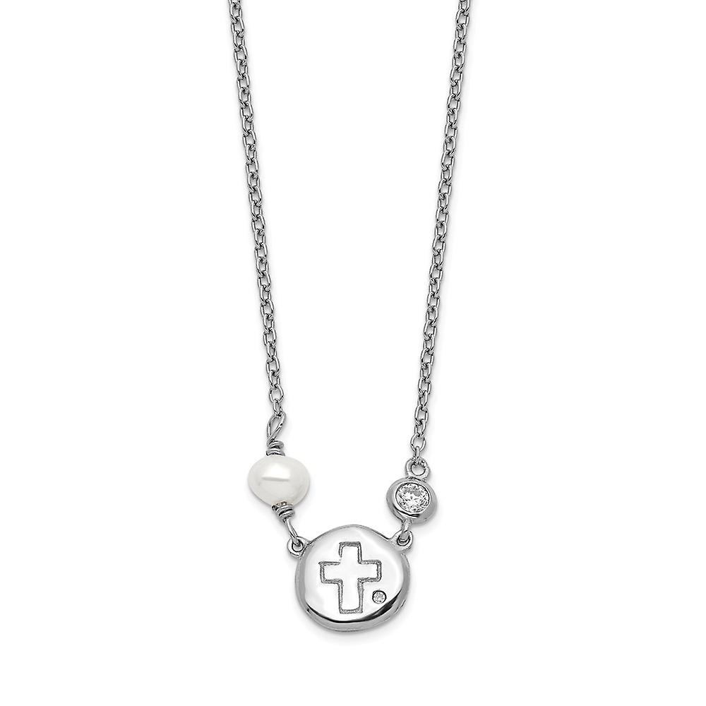 925 Sterling Silver Rhodium Plated Cubic Zirconia Religious Faith Cross and Fwc Pearl With 2inch Ext Necklace 16 Inch 0.