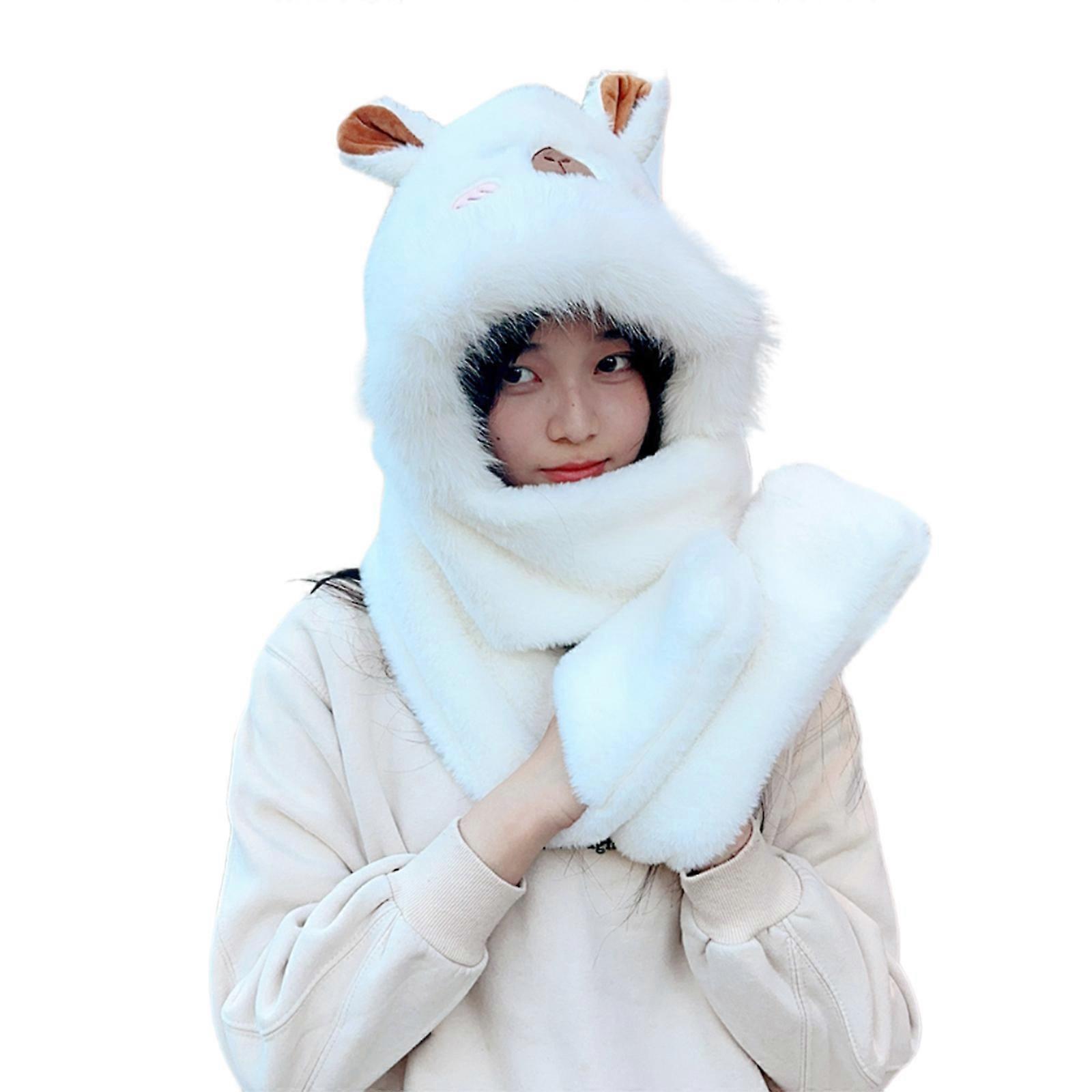 Lovely Cartoon Bear Ear Hat with Ear Flap for Women Multiuse Plush Trapper Hooded Hat Outdoor Activity Scarf Gloves Hat White