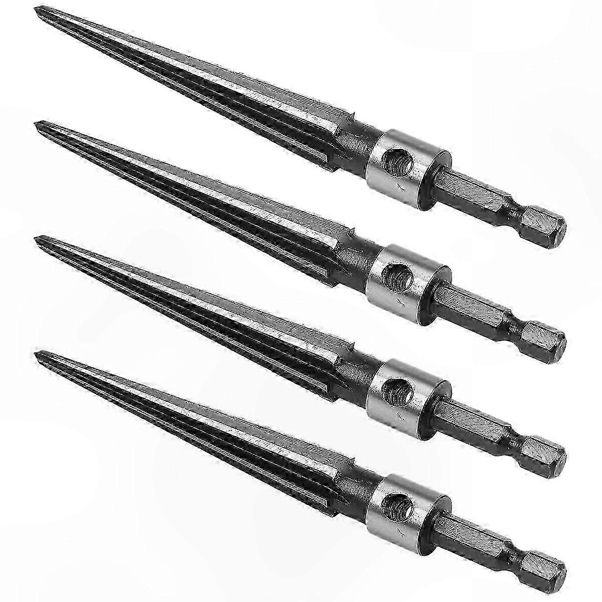 The reamer has 6 flutes with a T-handle and includes handles to help maintain round holes. Made of hardened carbon steel with ground steel edges. These steel reamers feature appropriately sized holes for bridge bolts or pins. Suitable for conical holes in wooden boards, wooden sink holes, chamfering, and inverted cone applications. Conical reamer only; other accessories shown in the image are not included. Use: wood drills, woodworking. Model Number: 3mm-13mm bridge bolt manual hole reamer T tapered handle. Type: drill bit. Size: 128 x 85mm. Material: steel. Color: Black + Silver. Package Contents: 4 x Tapered Reamer
