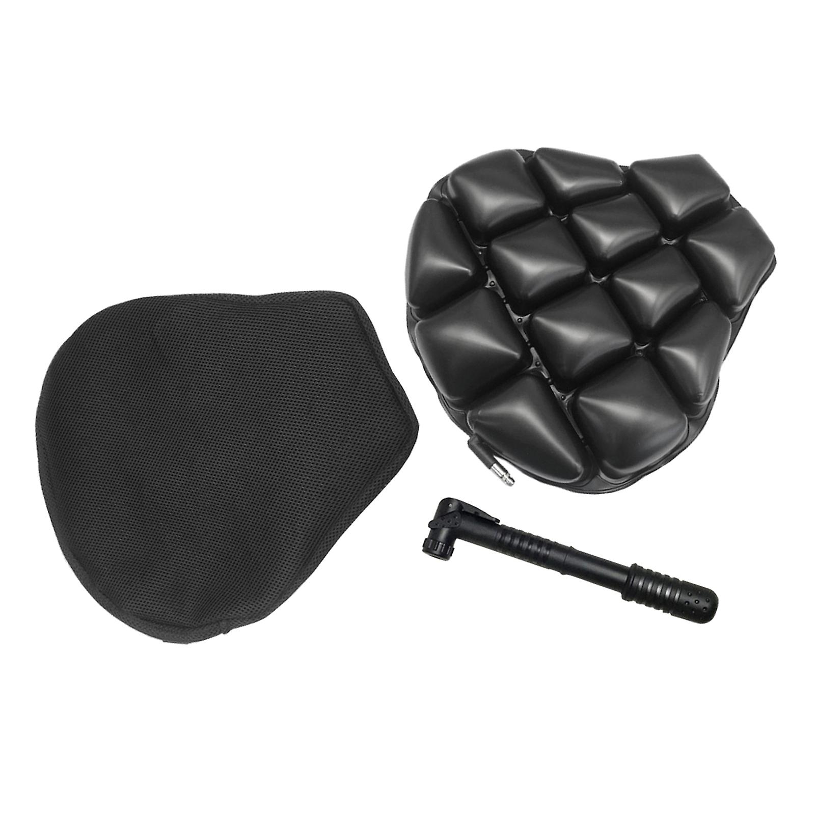 Description: Inflatable Seat Cushion with Black Cover Unique inflatable, multiple-cell design for the ultimate in comfortable seating and vibration absorption. Made from polyurethane and features a breathable, stretchable outer cover and a nonskid urethane base to protect your seat. Open mesh protector cover drains water and dries quickly so 't get a if your bike gets wet, great motorcycle camping gear . Compact size motorcycle accessory includes air pump. Packs easily and can also be used as a regular seat cushion when you travel so you can sit comfortably just about anywhere. Specification: Thickness: 60mm/2.36" L Size: 310x300mm / 12x11.8 inch XL Size: 375x360mm/14.8x 14.2 inch Material: polyester fiber TPU Package Includes: 1x Motorcycle Seat Cushion 1x Cushion Cover 1x Air Pump
