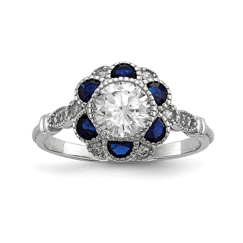 925 Sterling Silver Rhodium Plated Cubic Zirconia and Simulated Blue Sapphire Flower Ring 1.73mm Wide <mm Thick-Ring for