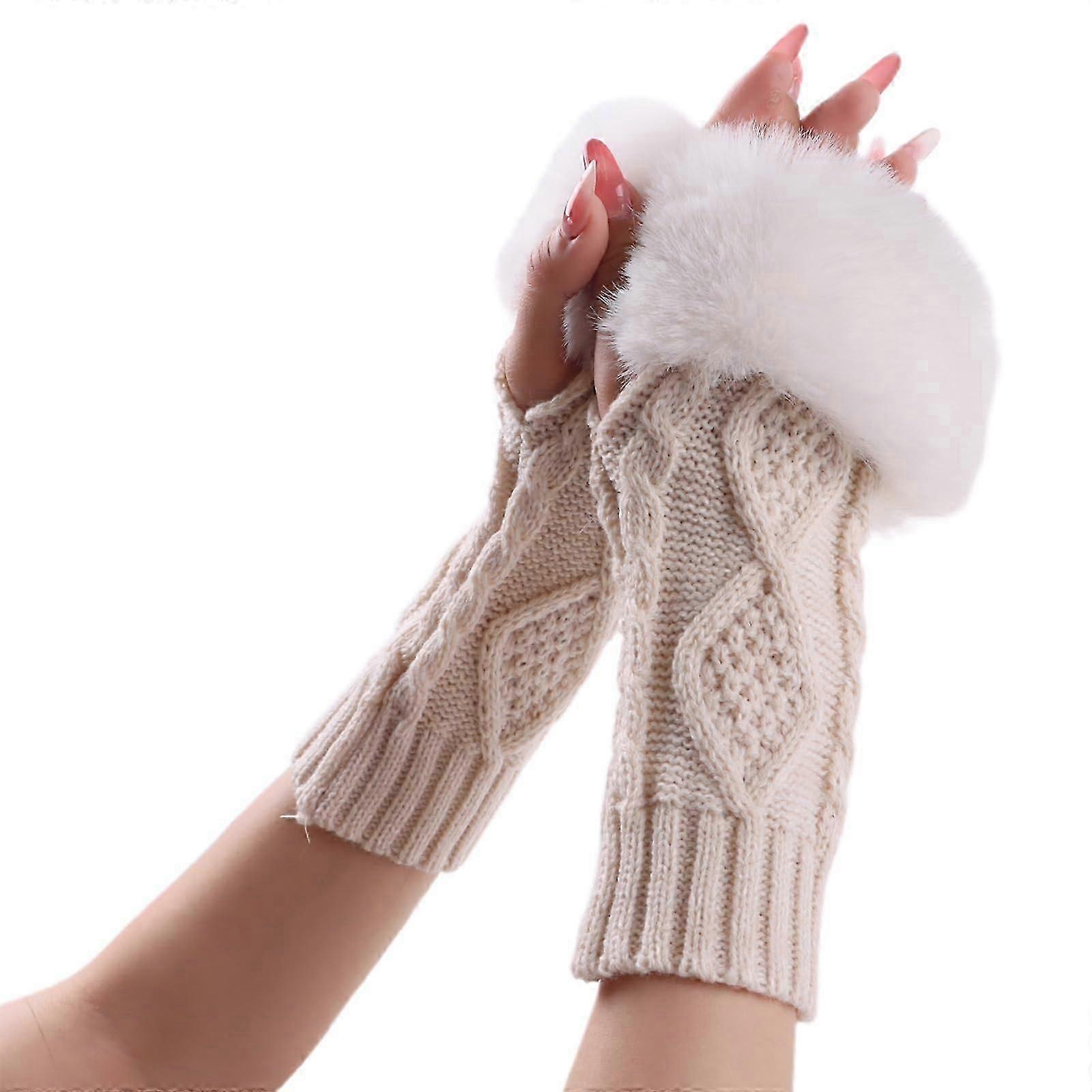 Knit Faux Fur Fingerless Arm Warmers for Women Winter Wrist Warmers with Thumb Hole