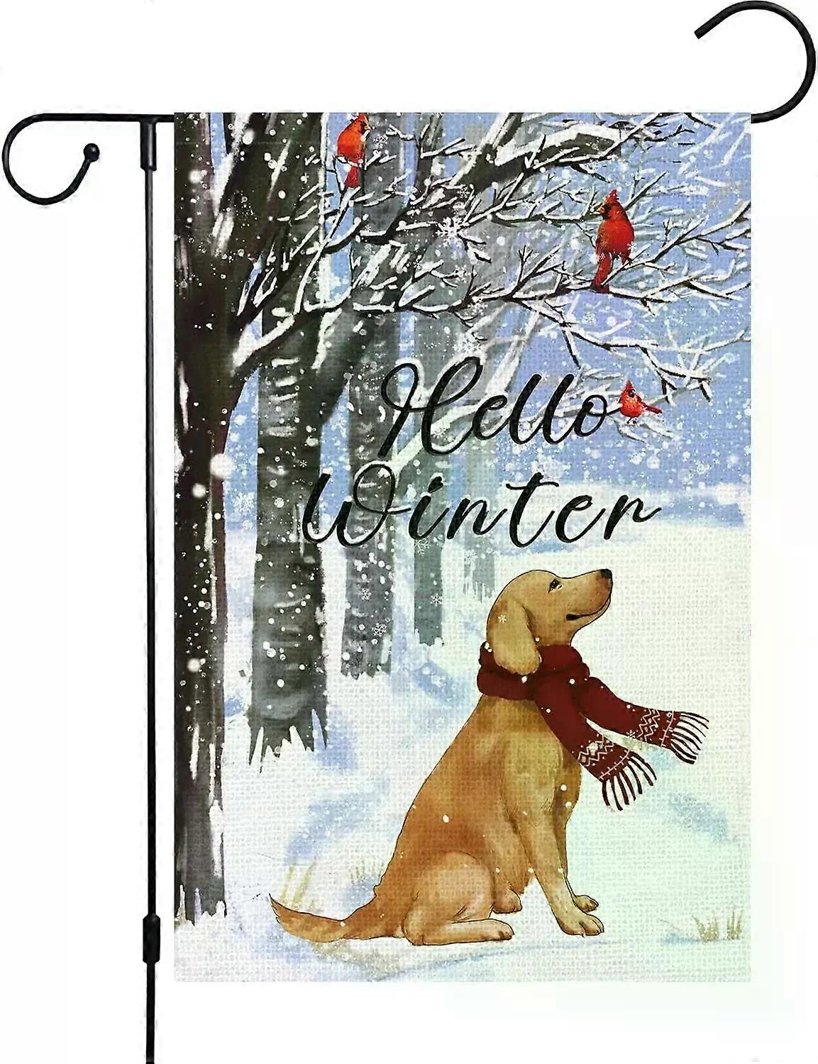 Hello Winter Dog Garden Flag 12x18 Double Sided Burlap Farmhouse Small Golden Cardinal Retriever Garden Yard Flags for Winter