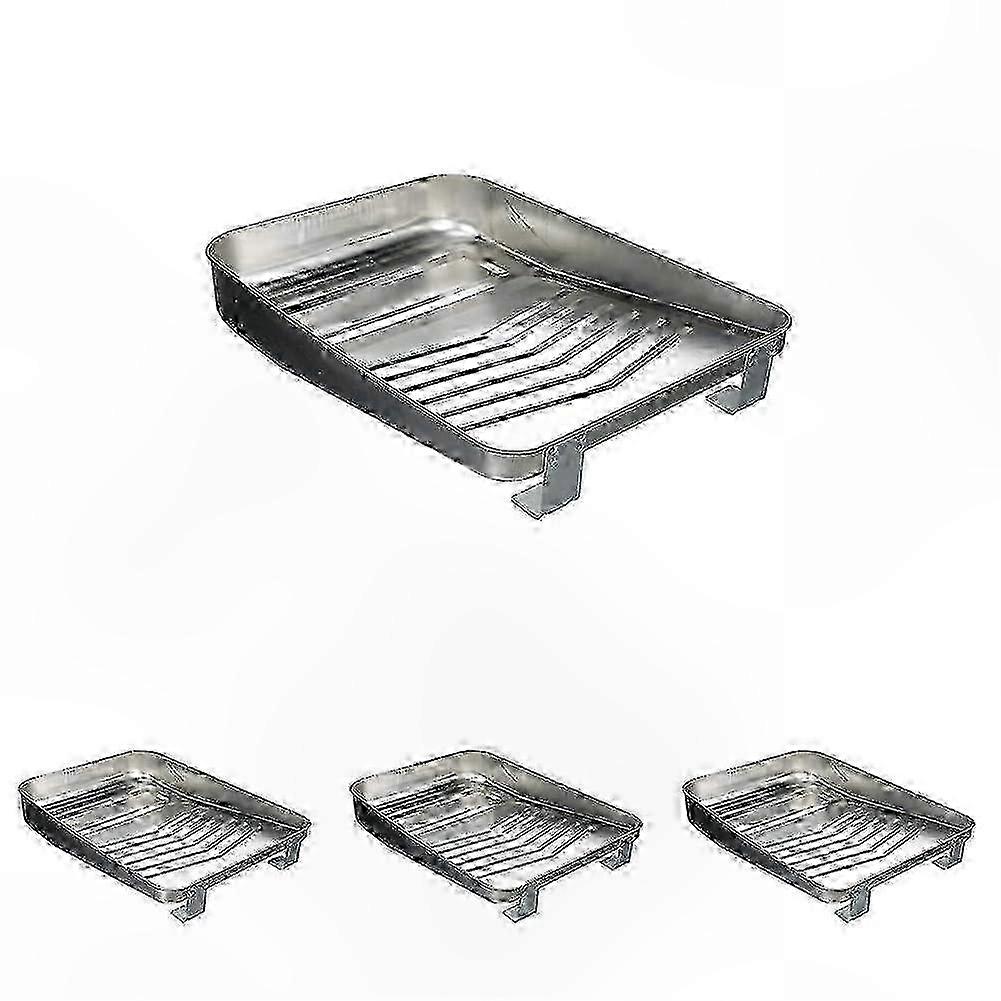 1. The information below is per-pack only 2. 9 inch reusable metal paint tray 3. Ideal for holding paint or primer 4. Ribbed area helps evenly load roller with paint 5. Two legs create an angled shape that funnels paint to the base 6. Can be used with paints and lacquer