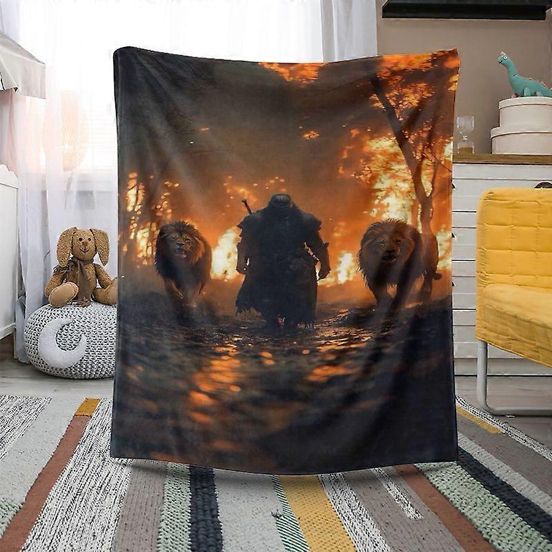 Black Cape Hero and Guardian Lion Crossing Flame Forest Themed Pattern Ultra Soft Digital Print Flannel Blanket, Ultra S-asdfg315