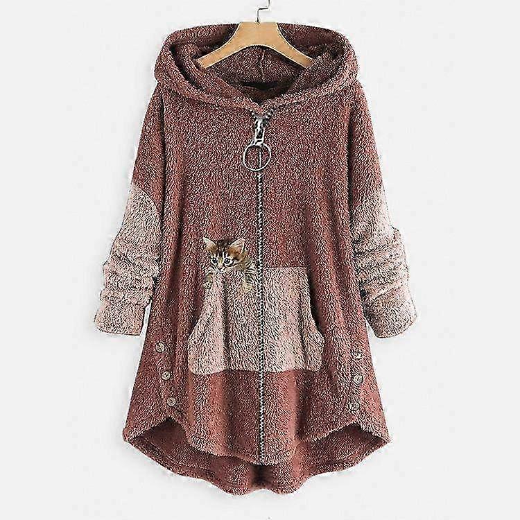 Plus Size Women's Warm Fleece Hoodie Top with Cat Embroidery - Cozy Zipper Sweater Blouse for Cat Lovers