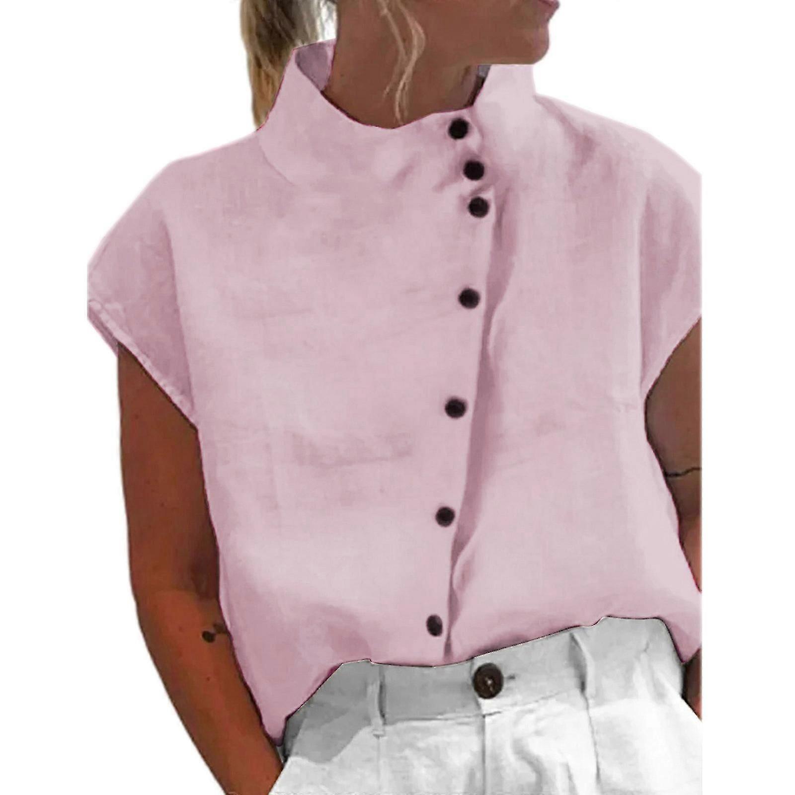 Fashion Short Sleeves Shirt Top For Women Stand Collar Blouse All-matching Button-down Blouse Summer Cotton Linen Blouse White Xl
