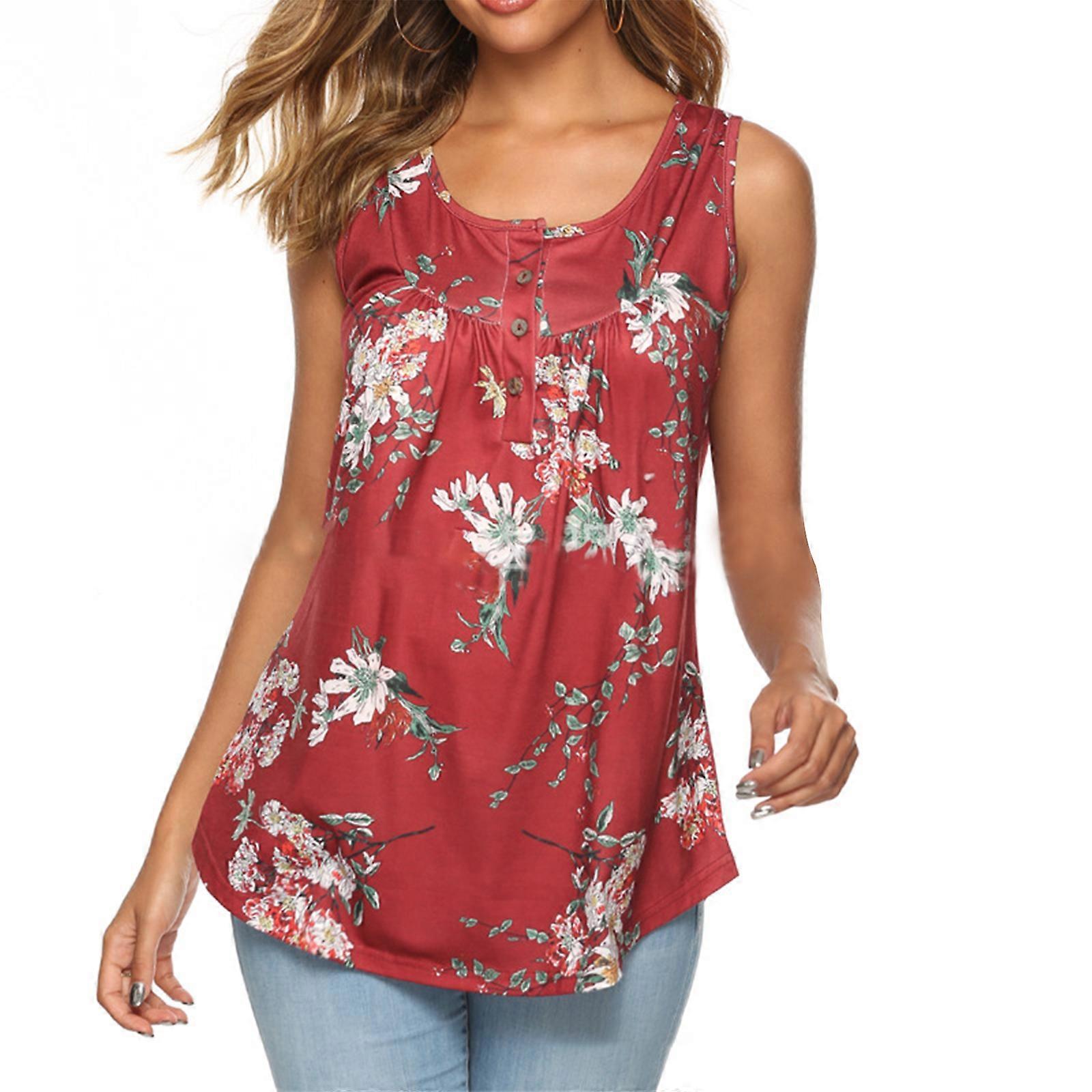 Womens Casual Tops to Wear for Leggings Sleeveless Floral Blouses V-Neck Flower Print Button Down Summer Shirts Claret XL