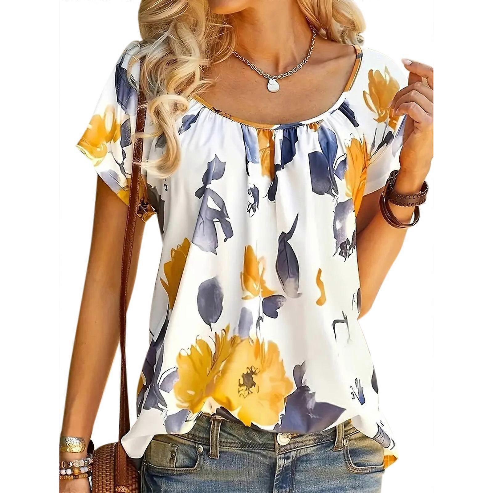 Nackline Basic Ruffle Sleeves Loose Fit O-Neck Blouses Flower Print Shirt Girl Summer Wear for Womens Summer Yellow XL