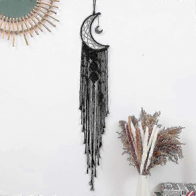 Boho Macrame Woven Wall Hanging, Crescent Moon Star Dream Catcher Long Tassel Cotton Cord Handmade Home Decor Ornament Without Light Decoration Art Cr