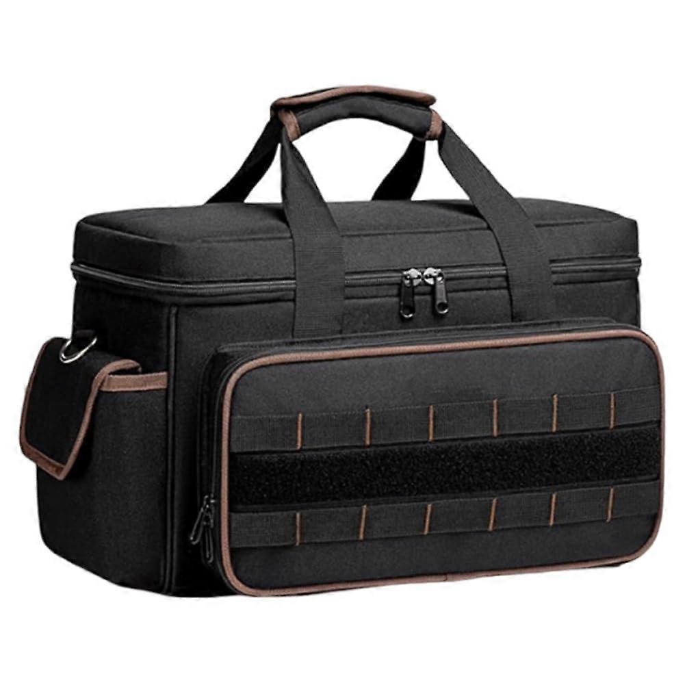 HeavyDuty Wide Mouth Tool Bag – Built for Professionals Durable Construction: Made from quality 900D Oxford fabric, this tool bag is wearresistant, scratchproof, and waterproof, ensuring reliable performance in demanding environments. Reinforced stitching enhances strength, while antislip rubber feet provide stability and protect the base from rough or wet surfaces. Generous Storage and Organization: Measuring 17 inches long x 10.6 inches wide x 9.8 inches , this tool bag offers ample capacity to store a wide range of tools. Equipped with 20 pockets, it keeps tools neatly organized, protects them from scratches, and makes them easy to access. Ideal for electricians, technicians, and anyone needing a portable tool storage solution. Comfortable Carry Options: Designed to handle heavy loads, the bag features soft padded handles and an adjustable shoulder strap. These reduce strain on hands and shoulders, allowing flexibility to carry by hand or over the shoulder, even during extended workdays. Full Open Wide Mouth Design: The large flap opening enables the bag to fully stand upright when open, making it simple to view, arrange, and retrieve tools quickly. This design maximizes internal visibility and space efficiency, reducing time spent searching for items. Practical Applications: 1. OnSite Electrical Work – Keep essential tools organized and protected while moving between projects. 2. Automotive – Carry wrenches, sockets, and diagnostic tools securely from the garage to the vehicle. 3. Home Renovation – Transport drills, screwdrivers, and measuring tools with ease for indoor and outdoor projects. This wide mouth tool bag delivers durability, organization, and carrying comfort, making it a dependable choice for professionals seeking efficient tool storage and transport in any work environment.