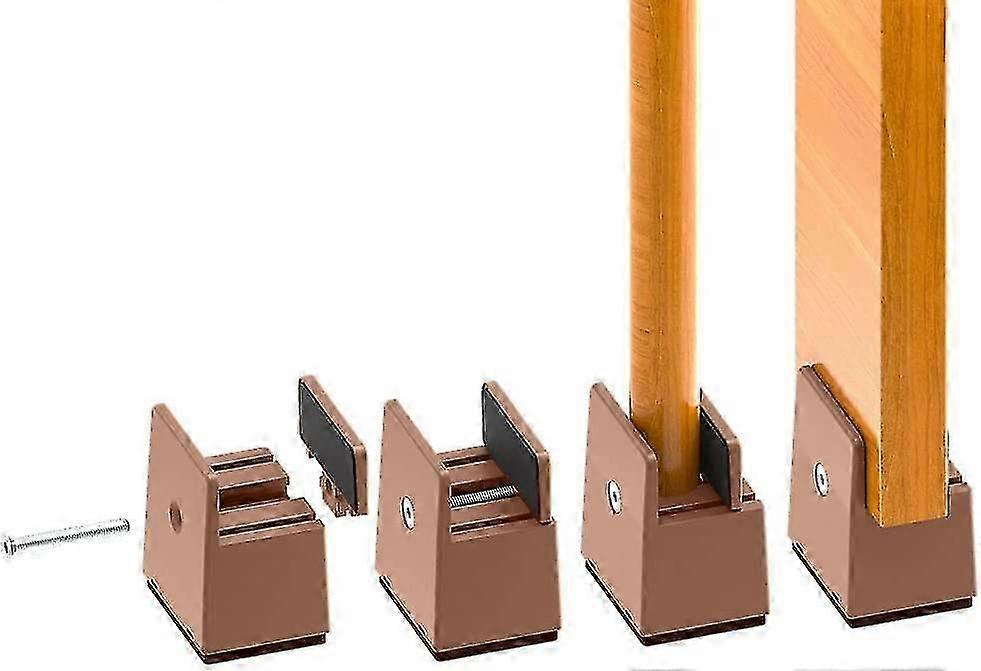 Adjustable clamp fixing system2 inch furniture extension and table extension, increase the height by 50 mm.The table leg extension is suitable for desk leg with thickness from 0 inch to 1.5 inch 0-38mm. You can adjust the distance to your furniture frame as you like and tighten it with a screwdriver provided to prevent it from wobbling. Don't fall off easilyUnlike other grooved furniture risers without clamp, any slight movement may cause the risers to become unstable and fall off furniture feet.Our rail betterhighers hold the frame firmly with the help of the clamp and do not fall off lifting and moving the furniture. Rise the height of 2 inches4 PACK Furniture feet black or brown Furniture lifters, bed raisers, table raisers, furniture raisers for heavy furniture for wardrobes feet, bathroom cabinet, table feet writing table.Creates extra 2 inches of storage space under your bed. Raises your bed, making it easier to clean under furniture, especially good for robot hoovers. Rugged Better ElevatorsMade of sturdy materials, so these furniture elevators are super strong and durable and can easily lift up to 5000 pounds. Not only good for lifting beds and mattresses, but also ideal for lifting nightstands, sofas, tables, desks,cabinets and bookshelves at home and office, make your legroom more comfortable. Protect your hard surfacesDesign with felt pads on the bottom.Daily use and moving furniture can damage your hard floor surfaces.These furniture risers protect your hardwood, ceramic tile and linoleum floors from damage and scratches. Note: Due to the light and screen setting difference, the item's color may be slightly different from the pictures. Please allow slight dimension difference due to different manual measurement.