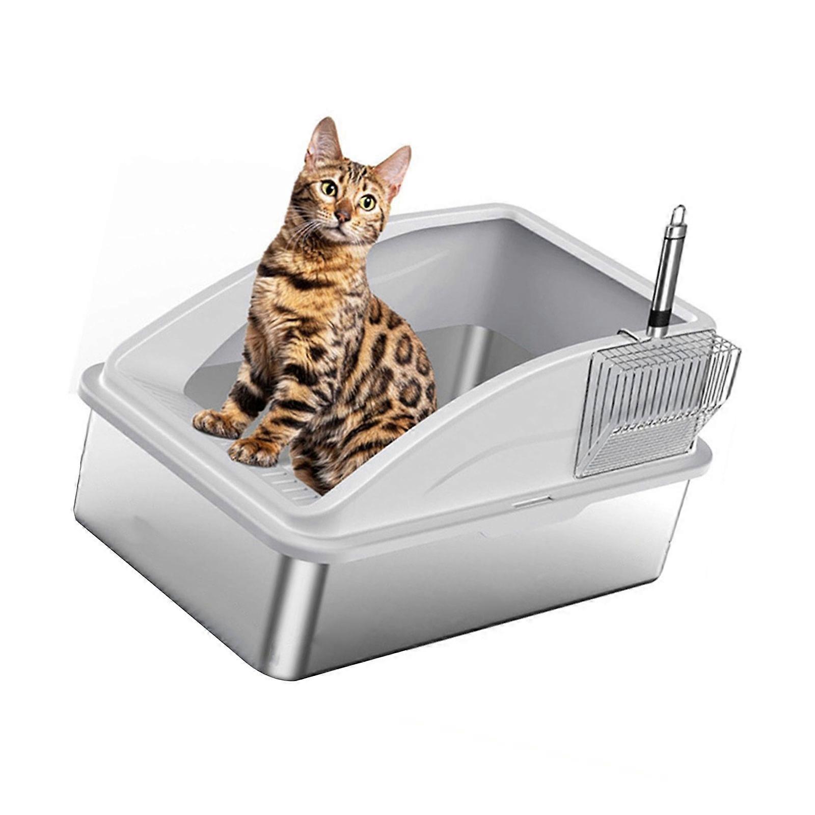 Spill Resistant Enclosed Stainless Steel Litter Pan For Cats with Scoops Odor Prevention Splashprevent Cats Litter Box Light Grey