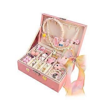 Caixa de joias das crianças com 37pcs conjunto de joias das meninas pequenas, caso de couro Pu com espelho e fechadura, rosa