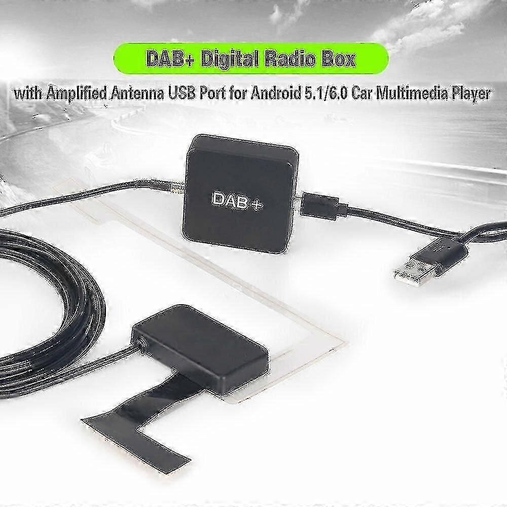 KEY FEATURES:- DAB+ Digital Audio Broadcasting Receiver Box, if your android 5.1/6.0 car multimedia has pre-installed the DAB+ App,just buy this USB powered DAB+ Box to get digital radio. which can fit all our Erisin android car multimedia and the most of other android 5.1/6.0 unit on the market . With this DAB+ Box, you can enjoy the superior audio quality of DAB+ in your car from now on - The included antenna itself is advanced with amplified function, high sensitivity, use the MCX port to connect- Plug and play, USB Port supply power for DAB+ Box and the connecting Antenna, no need the extra power cable - Delicate Design, easy to install, with 1m USB Adapter Power Cable and 3m Antenna Cable- Stable receiving and high signal noise ratio, stereo output, class qualityParameter:- Working Temperature: -20~+70- Power Supply: 5V USB Port- Frequency Range: 174-240MHz- Channel Separation: 55dB- Channel Difference: +/-3dB- Input Impedance: 50Ohm- Antenna Input Type: MCX- Lenght of USB Adapter Power Cable: 1M- Length of Amplified Antenna Cable: 3M- Shipping Weight: 150g What is DAB+DAB is the third generation broadcast after the traditional analog broadcast AM/FM Digital Audio Broadcasting. DAB+ is an upgraded version of the original DAB technology. It can be compatible with DAB as well.The new radio standard DAB: Digital Audio Broadcasting allows you multi-regional music with your local well-known andalso new channels. CD sound quality and noise-free in excellent transmission make DAB Radio a special experiencein the vehicle. DAB+ (Digital Audio Broadcasting) has gradually replaced the traditional analogue broadcast AM/FM. Permanent increase in channels and expansion of the station area soon make DAB accessible to most of Europe. How to operate on the DAB+ box1. After you connect the DAB+ with the car Multimedia, click on the DAB+ app (this should be installed in advance).2. Check the DAB+ signal, see upper left corner for the signal status.3. Click the search icon, it will find the DAB+ stations, and save on the right side. Package content:- 1* DAB+ Box- 1* 1M USB Adapter Power Cable- 1* 3M Amplified Antenna- 1* Users Manual in English and German