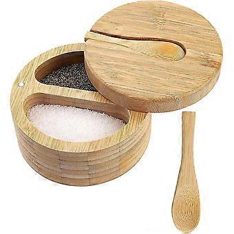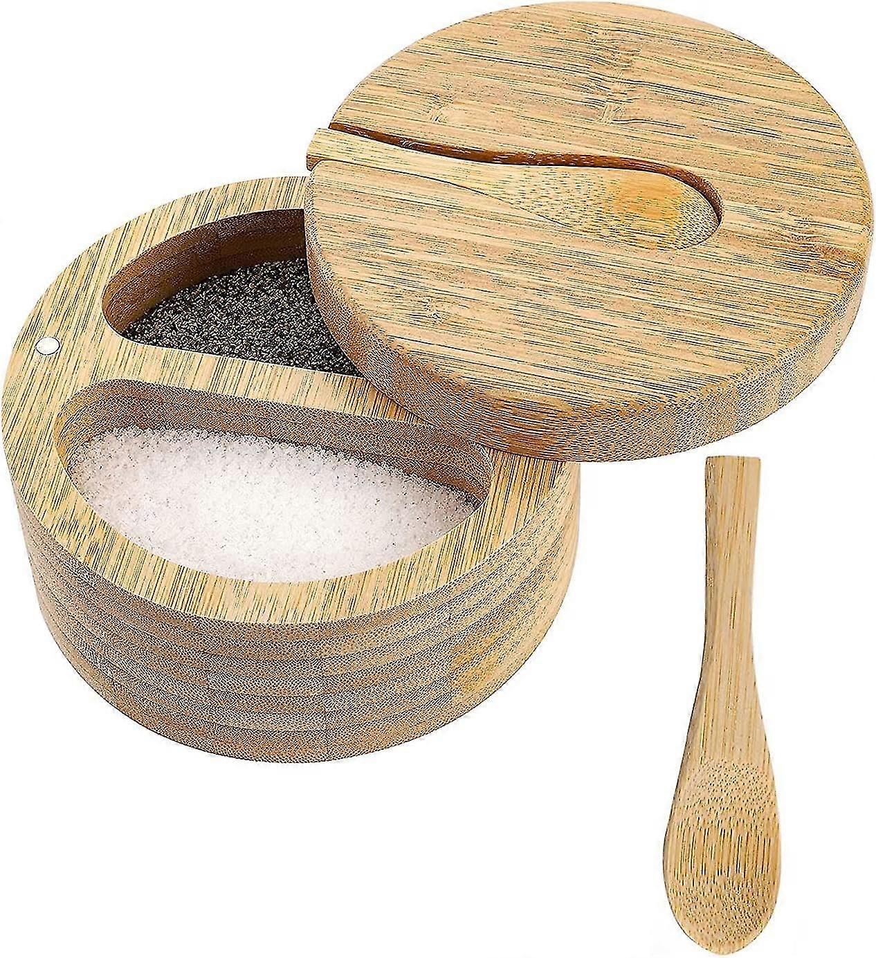 Bamboo Seasonings Box With Spoons, 2-compartment Bamboo Salt And Pepper Box With Swivel Magnetic Lid For Salt Pepper Brown