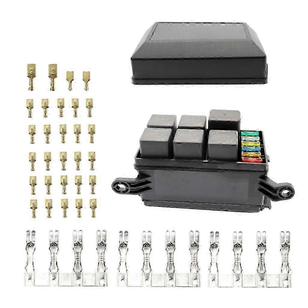 Description <br> Description: <br> This is a 6 Way Fuse Box 6 Way Standard Relay Box clipped together to form one single integrated unit. <br> Fitment: for middle size fuse (ATC, ATO). <br> Suitable for all marine, motor-home, automotive motorsport applications. <br> Waterproof connector.Can be installed in circuit. <br> Can be fixed through 2 pre moulded holes on side. <br> Can be installed in circuit. <br> Waterproof connector. <br> Specification: <br> Base Material: Thermoplastic <br> Color: Black <br> Way: 6 Way <br> Cover material: Plastic <br> Max current: 12V <br> Size: Approx.18.5x9.3x11cm <br> Include: <br> 1pcs 6-way fuse box 6 relay holder <br> 41pcs spade terminals. <br> 6pcs ATO/ATC Fuse (5A,10A,15A,20A,25A,30A). <br> 5pcs 5Pin 12V 40A Relays <br> 1pcs 4Pin 12V 40A Relay <br> <br> Package Includes: <br> 1 Piece Relay Holder Box <br> 6 Pieces ATO/ATC Fuses <br> 5 Pieces 5Pin 40A Relays <br> 1 Pieces 4Pin 40A Relay <br> 41 Pieces Spade Terminals <br>