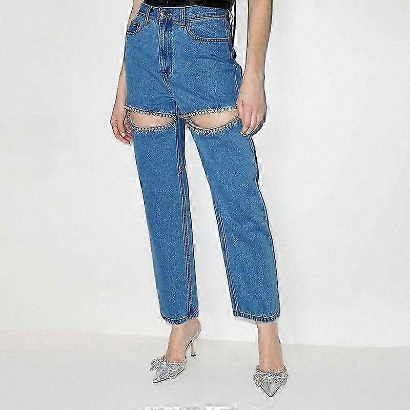 Mid-Waist Straight Leg Jeans with Beaded Embellishments and Thigh Cutout Design for Women