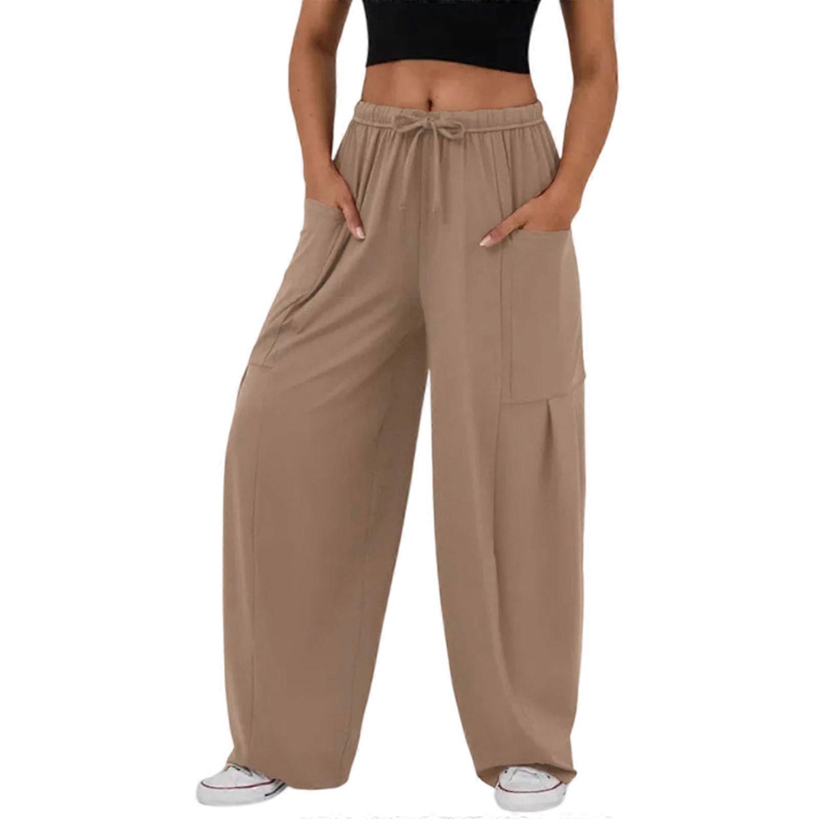 Womens Palazzo Pants Drawstring Elastic Waist Casual Wide Leg Trousers with Pockets Beach Travel Trousers Gifts Khaki XL